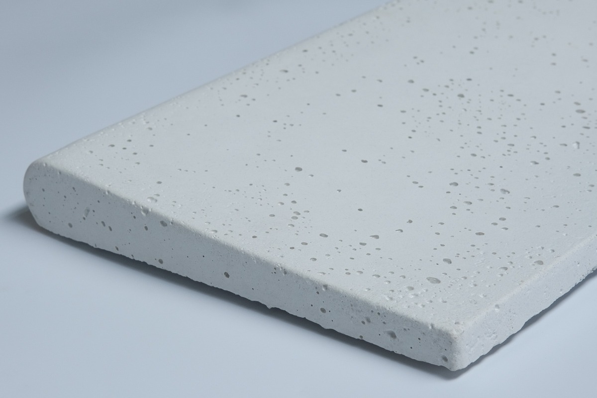 Produzida com cimento branco e pedriscos a borda atérmica, possui textura porosa e superfície antiderrapante, ideal para áreas externas e bordas de piscina.